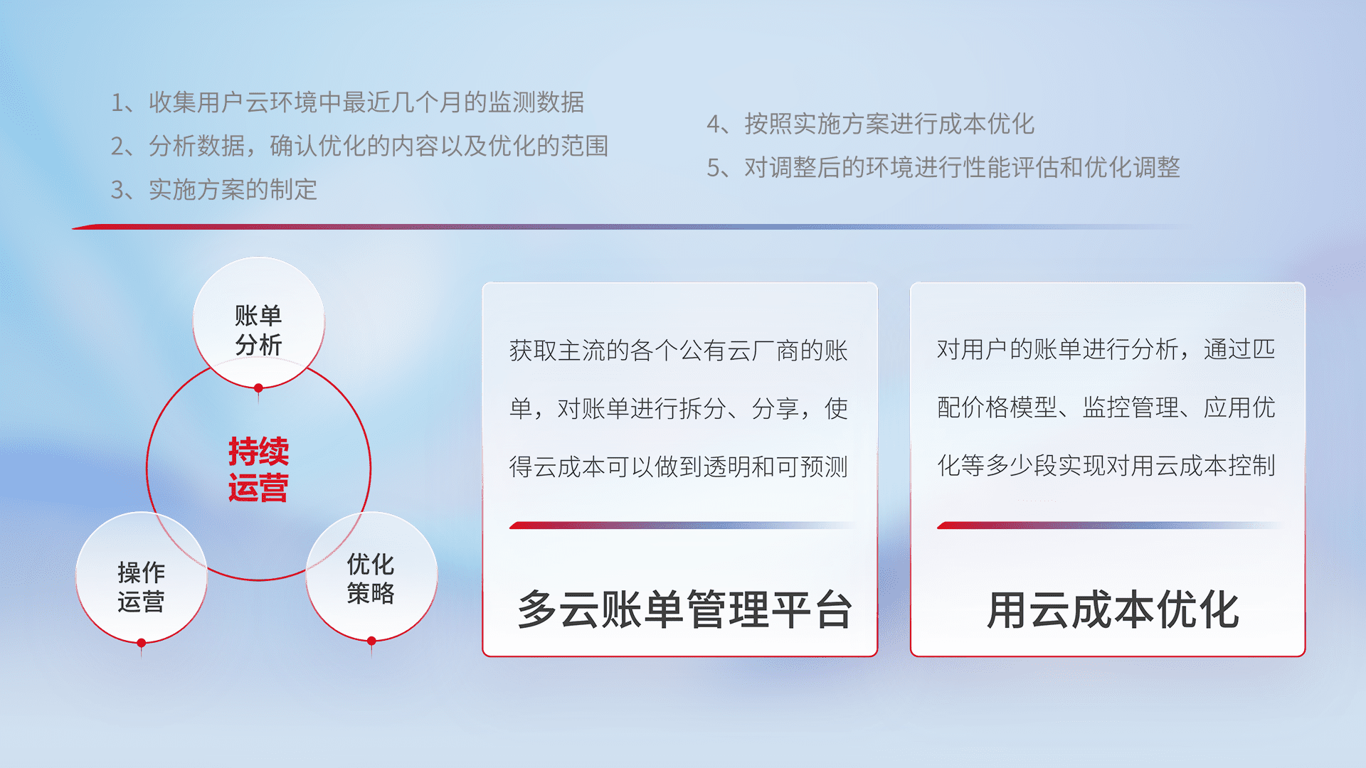 通过多云纳管,,,以统一的资源数据模型把客户的云资源进行抽象和封装,,,,进而实现对多云资源的统一操作,,保障云资源管理的可靠性、、、、稳定性与可用性。。。量身定制化运维内容,,配置、、开发运维、、、、补丁管理、、、备份、、、监控、、、、认证和访问管理、、、审计和日常巡检等,,,,保障在用云过程中的可靠度,,,,稳定度以及高可用率。。。。